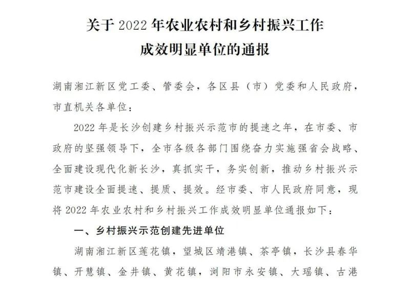 2022年是长沙创建乡村振兴示范市的提速之年,在市委、市政府的坚强领导下,全市各级各部门围绕奋力实施“强省会”战略、全面建设现代化新长沙,真抓实干,务实创新,推动乡村振兴示范市建设全面提速、提质、提效。