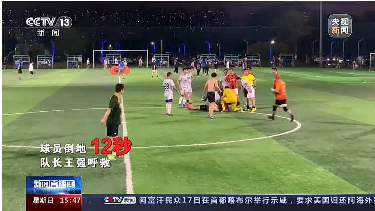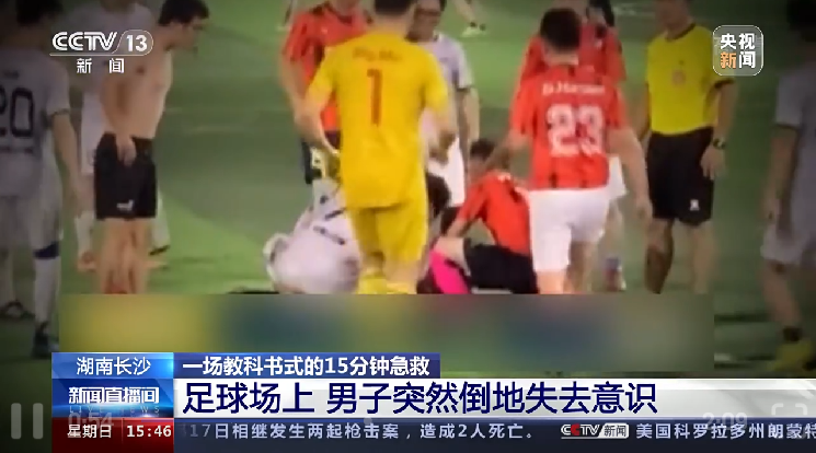 央视新闻:湖南长沙 一场教科书式的15分钟急救 足球场上 男子突然倒地失去意识